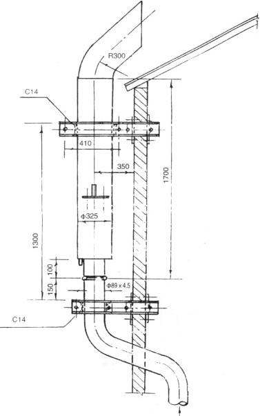 ⑥對(duì)用于除氧器、射汽抽氣器排汽等小排量的消聲器,外型設(shè)計(jì)成管式,安裝較為方便。安裝方式如圖4所示,消聲器垂直的沿主廠房墻、柱安裝。在墻、柱上設(shè)置型鋼滑動(dòng)支架,將消聲器及管道架設(shè)其上,消聲器排放口應(yīng)對(duì)著屋頂方向。應(yīng)注意,該消聲器出廠時(shí)已制有固定支座,當(dāng)采用滑動(dòng)支架式安裝時(shí),固定支座可以不用。如圖4。
